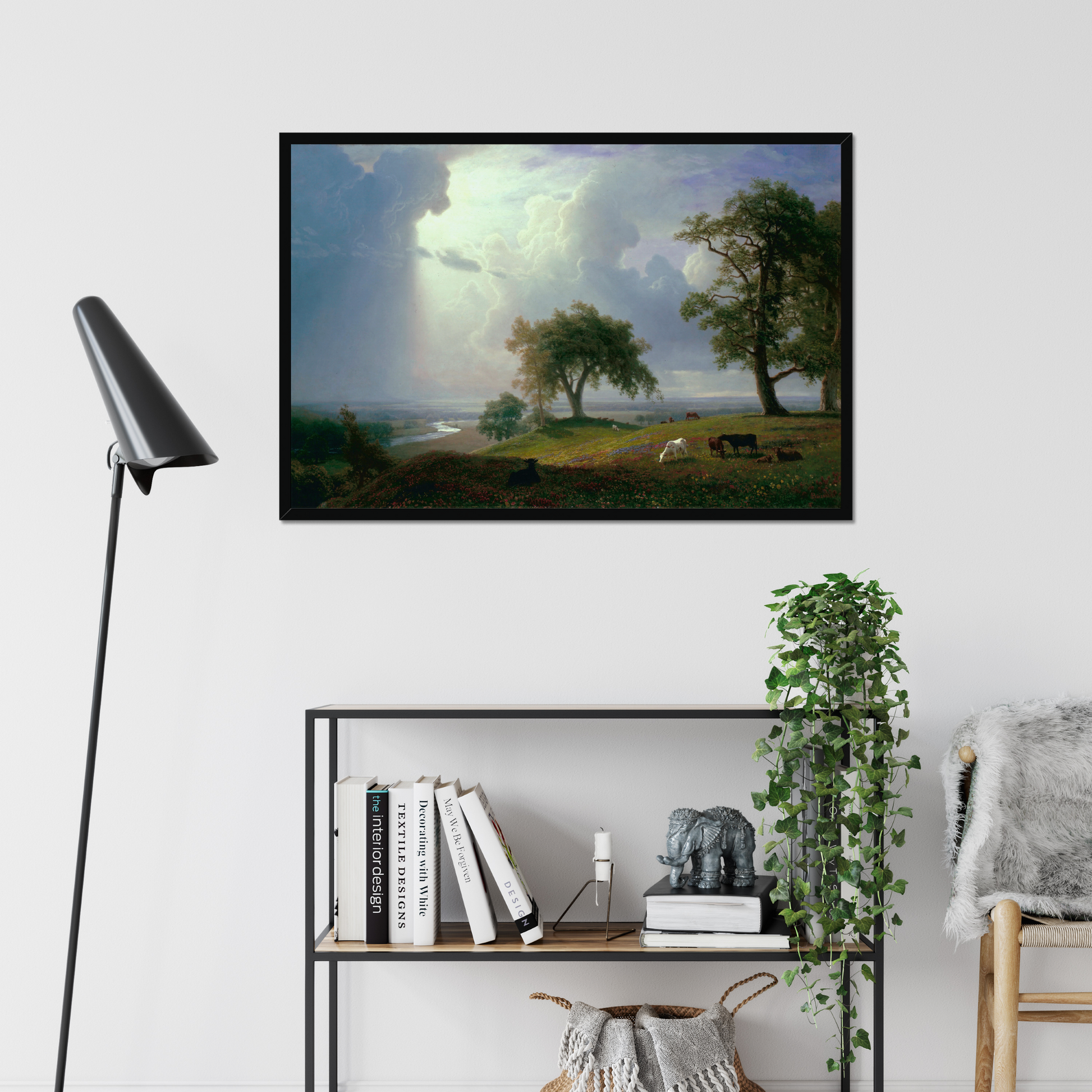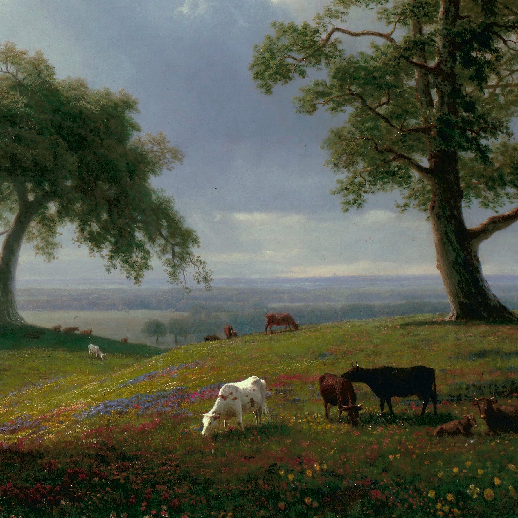 Cows are associated with calm and abundance, and oak trees are associated with strength and stability. The rolling hills and meadows, and the vast open sky capture the expansiveness of the landscape. It shows some of the best of California, where Bierstadt studied extensively.