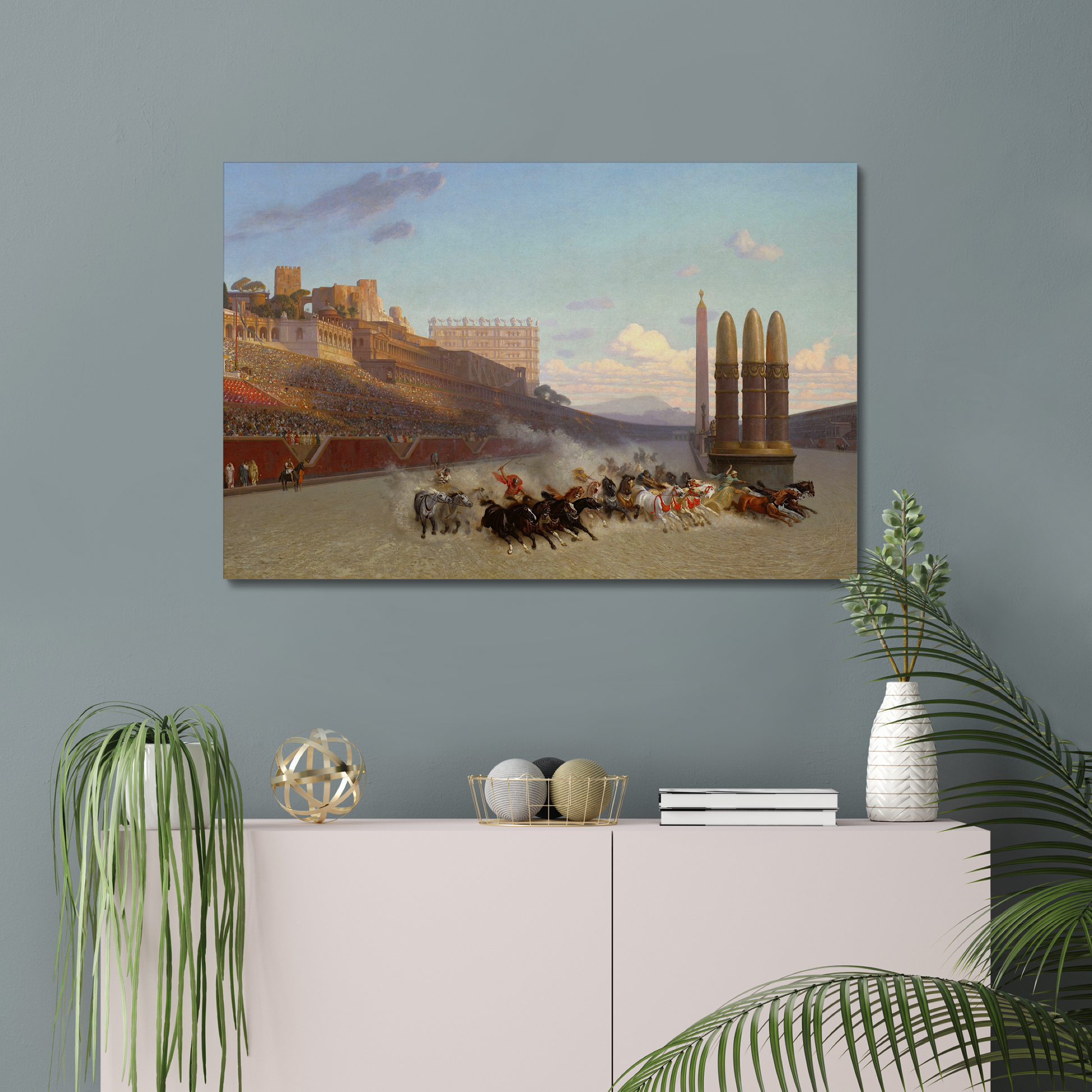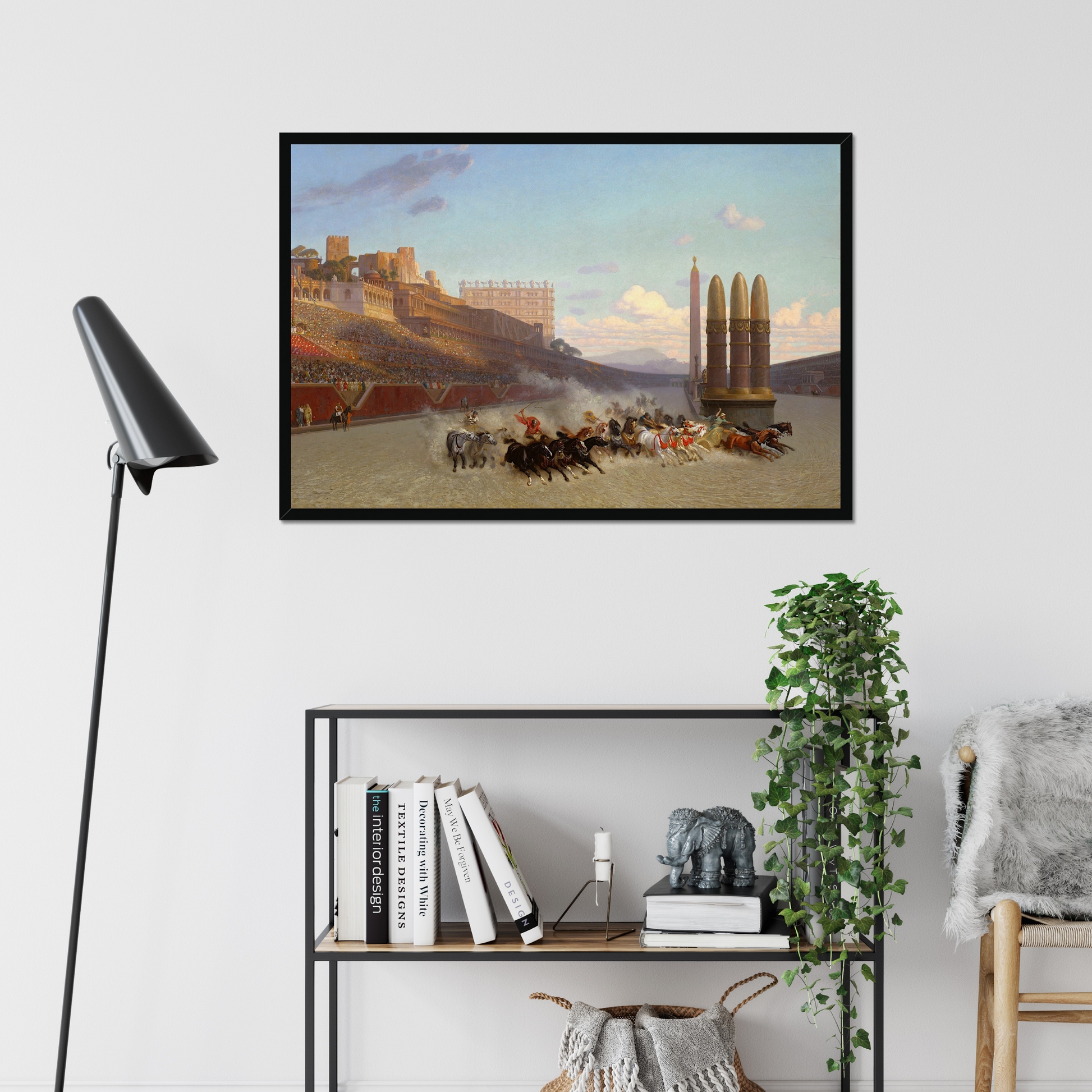 This painting shows Rome's Circus Maximus, a track that was almost half a mile in length and could fit over 150,000 spectators. In a chariot race the turn is where there tends to be the most action, since that's when passing occurs and it's when the drivers are the most aggressive. That's what this painting shows - the peak of excitement.