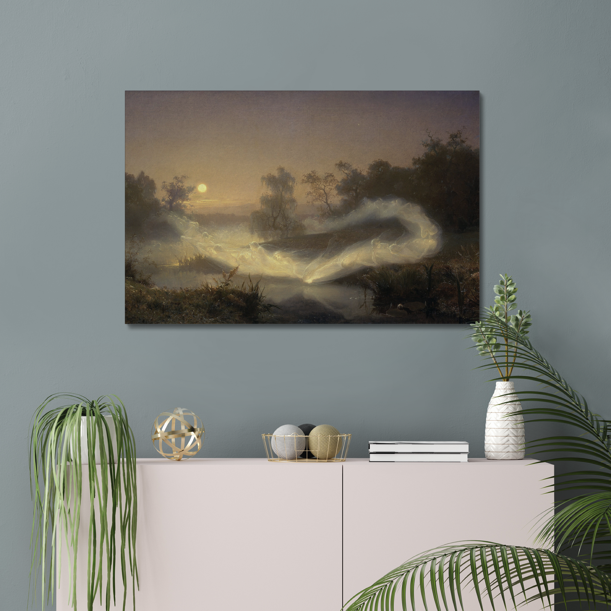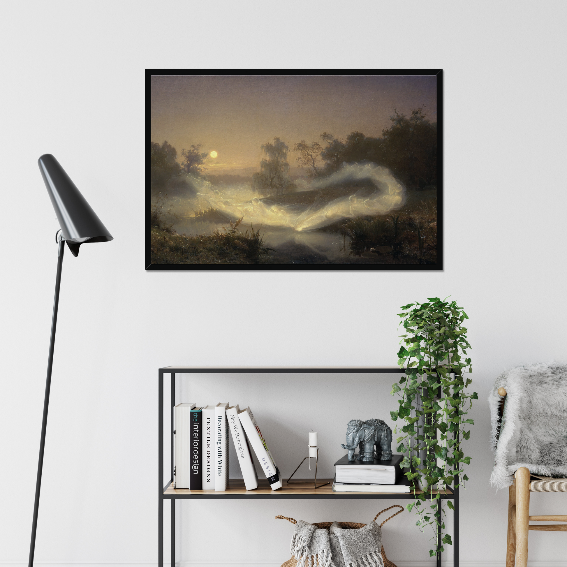 Fairies, which could also be called ghosts or spirits by the looks of them, are here flying across the water in the light of the full Moon. This painting creates a magical and mystifying atmosphere.