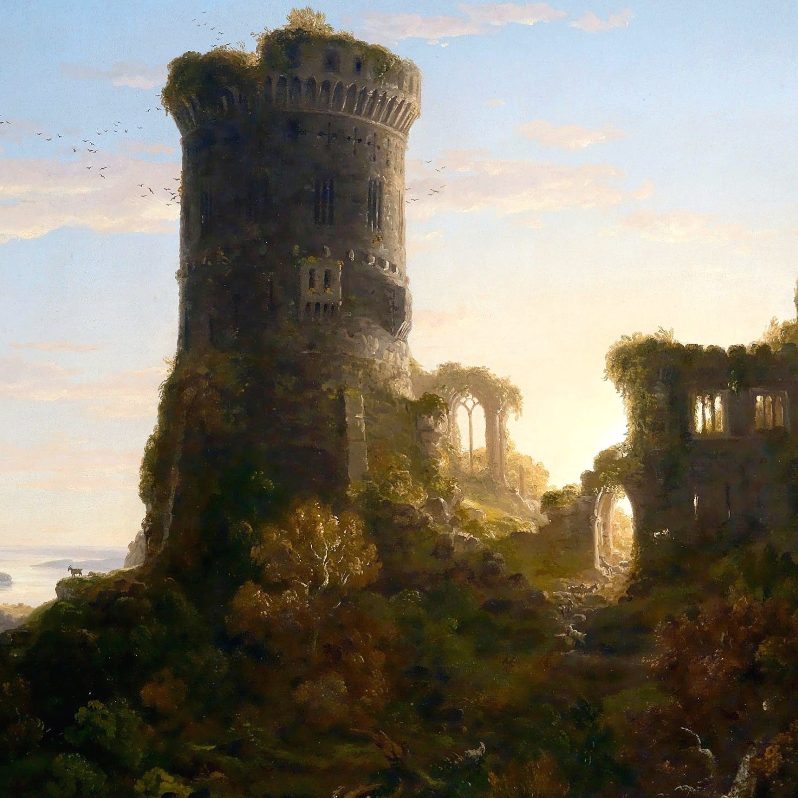 This painting is allegorical and symbolic. The ruined castle represents the future. It has a glowing doorway that represents hope and opportunity, which you must climb up to and then walk through.